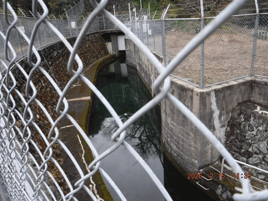 赤橋も瀬切れ状態(画左上)最下流電力取水の導水路(画右上)で7寸2匹目視しましたが