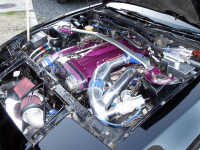 | エンジン関連 | RB26DETT+GT2530ツインに換装。 RB20オイルパン加工取り付け。200ZRエンジンメンバー、ステアリングギアボックス使用。 200ZRミッション。エクセディトリプルクラッチ。300ZRラジエーター使用(残念ながらスペースの関係上 エアコンは無し。)。HKS GTR インタークーラー、オイルクーラー、エレメント移動キット使用。 BNR32純正エアフロメーター使用。アペックスエアクリーナー。HKSブローオフバルブ。 オイルキャッチタンク&ウォッシャータンク1体ワンオフ品。 |
