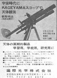 左の広告は68年のもの、これは70年頃の広告です。だいたい国際光学自体、怪しげです。 なんで、接眼部周りとかあんなにリッパなハンドルがいくつも必要なんでしょう。 2004.2.10 |